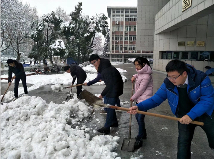 从4日开始,后勤集团及时启动扫雪铲冰应急预案,各中心职工及物业人员到岗就位,携带铁锨、竹竿等工具,冒着风雪,对路面积雪进行反复清扫。校园部分树木因大雪积压发生折断,物业人员自4日起不间断地对断枝进行清理,双休日不休息。绿化工人不间断地打落树上积雪,缓解被积雪压断枝状况,对倒伏树木进行了加固,确保校园主要道路、办公区、教学区、家属区等重点公共场所树木没有积雪。