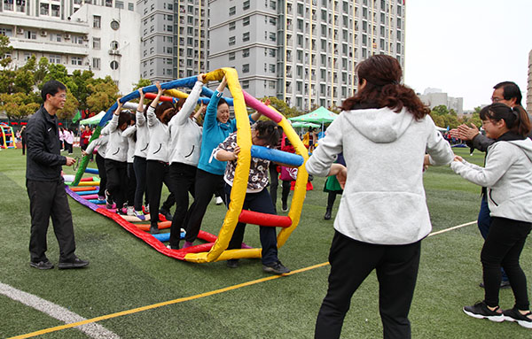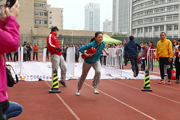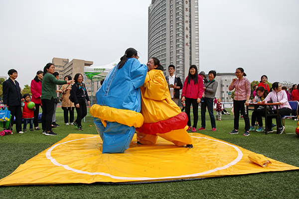 随着比赛的正式开始,坦克大战、套大圈跑、相扑擂台、快乐大脚、安全跑酷、蒙眼吃橘子和有氧舞蹈等集体和个人项目依次展开。为了活跃气氛,本次比赛还特别鼓励男教职工参与活动和服务工作。阳光下,女教职工们个个朝气蓬勃,形成了一道靓丽的风景线,整个现场气氛和谐而欢快,汇聚成一片欢乐的海洋。各个参赛队把团队精神和凝聚力展现的淋漓尽致,此起彼伏的加油声震耳欲聋,运动员的士气一场比一场高涨,给趣味运动会增添了浓郁的欢乐气氛。