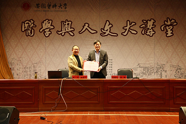 4月27日下午,我校素质教育品牌栏目“医学与人文大讲堂”第50期开讲。邀请了合肥工业大学钱斌教授为我校师生做了题为“丝路上的大国情怀”的报告。校党委书记李俊主持报告会,并向钱斌颁发了“医学与人文大讲堂”荣誉证书。
