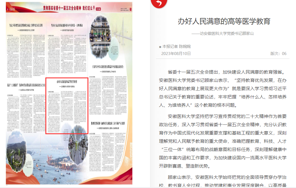 学校也始终坚持把科技创新作为“第一动力”,积极构建学科、平台、人才、资源、转化等全链条创新体系。对标“双一流”建设目标,安医大集合优势力量打造基础医学、临床医学、药学、公共卫生与预防医学、生物学等5个学科群,8个学科进入ESI全球排名前1%;正在打造占地2137亩、集“政产学研用”一体化、智慧化的新医科中心(新校区);瞄准生殖医学、脑科学等前沿领域,集中优势力量联合攻关,近3年荣获国家自然科学二等奖1项、立项国家自然科学基金343项。顾家山表示,学校将坚持“四个面向”战略方向,实施“有组织科研”,聚焦重点领域、重大任务系统布局,加强“政产学研用”五位一体深度融合,加快推进以破解临床医学难题为导向转化链建设,全面构建符合我省大健康产业发展的创新转化体系。