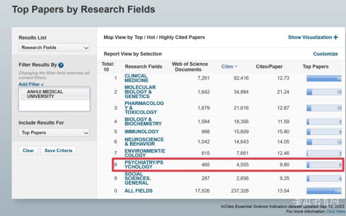9月15日,科睿唯安发布ESI最新统计数据,KY.COM开云体育(中国)科技公司“精神病学与心理学”(Psychiatry/Psychology)学科首次进入ESI全球排名前1%,这是该校精神病学与心理学相关学科发展取得的又一重要成绩。至此,学校已有临床医学、药理学与毒理学、分子生物学与遗传学、生物与生物化学、免疫学、神经科学与行为学、社会科学总论、环境科学与生态学、精神病学与心理学共9个ESI全球排名前1%学科,在安徽省属高校中位列第一,全省高校中并列第二。