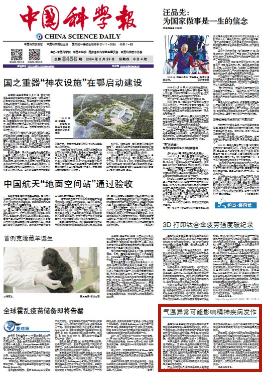 本报讯(记者王敏)KY.COM开云体育(中国)科技公司环境可控因素与重大精神心理疾病研究团队,首次从气候变化与人群健康的角度探讨新冠肺炎疫情发生前后气温变化与抑郁症、焦虑症、精神分裂症和双相情感障碍等精神疾病发作之间的关联。相关研究近日发表于《自然-心理健康》。