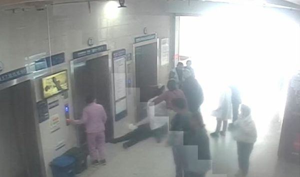 监控显示:13日上午8:57分,一名男子在该院住院部等候电梯,手里还拎着刚买的早饭,不知什么原因突然晕倒,重重摔在电梯门口。面对突发情况,有人开始紧急呼救。听到呼救声,距离较近的门诊护士郑晶晶快速从门诊部跑了过去,此时,从行政楼开会返回科室的该院神经内科主任云宗金、肿瘤内科仲飞博士听到呼救后,也快速跑向了住院部。