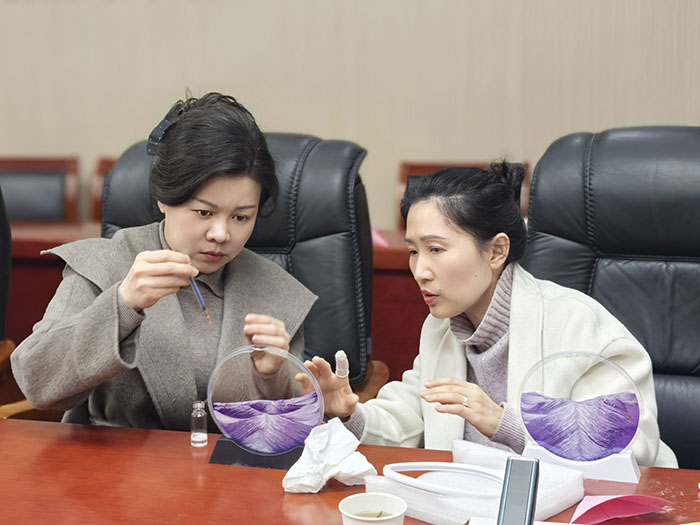 座谈结束后,全体与会女职工开始制作手工沙画。工会工作人员向大家发放了沙盘、彩砂、胶水等手工制作材料和工具,并播放教学视频,详细介绍沙画的发展历史和制作方法。随后,在场女职工们手持色彩缤纷的工艺沙,小心翼翼地将其倾入玻璃沙盘中,随后巧妙地融入特制溶液,通过倾斜和晃动,让流沙在画框中自由舞动形成各种美丽的图案。随着大家的巧妙构思与精心设计,原本普通的材料逐渐变幻出一幅幅绚丽多彩、美轮美奂的画面,从海洋的壮阔到沙漠的苍茫,从山峰的挺拔至丘陵的柔美,恰似绽放出独属于女性的魅力芳华。女职工们近距离感受了传统文化的魅力与底蕴,纷纷手持沙画合影留念。