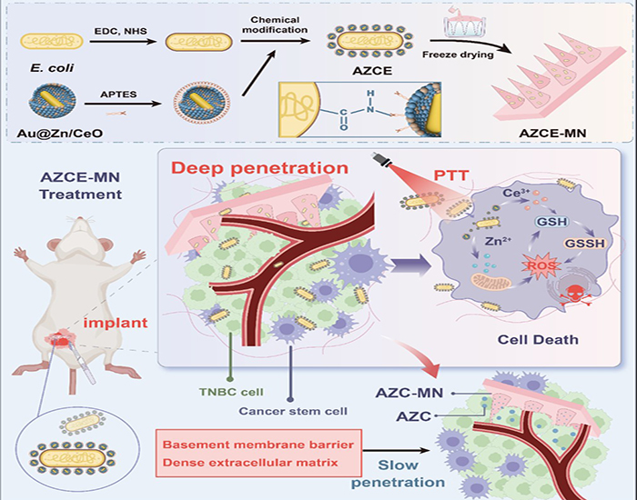 近日,我校生物医学工程学院钱海生教授团队在《先进科学(Advanced Science)》(IF=14.3,中科院一区TOP)发表题为《植入载有司帕沙星和硫锌锰纳米颗粒的微针用于术后三阴性乳腺癌处的免疫激活防止复发和转移(Implanted Microneedles Loaded with Sparfloxacin and Zinc-manganese Sulfide Nanoparticles Activates Immunity for Postoperative Triple-Negative Breast Cancer to Prevent Recurrence and Metastasis)》的研究论文,系统阐释了微针技术在根治三阴性乳腺癌(Triple-Negative Breast Cancer,TNBC)术后复发及清除肿瘤干细胞的创新应用。论文的第一作者是博士后储召友,钱海生教授为第一通讯作者,我校为第一通讯单位。