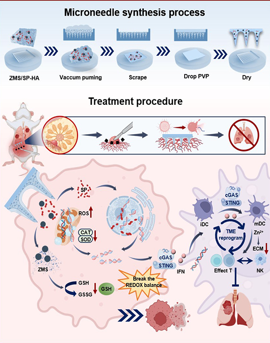 该设计中,微针直接将药物递送至术后创面,减少全身暴露风险;ZMS释放的金属离子与SP协同增强免疫原性细胞死亡(ICD),激活cGAS-STING通路;SP的抗菌特性联合Zn2+、Mn2+/4+的基质重塑作用,显著提升CD4+/CD8+T细胞浸润率。设计通过三重协同机制,在精准定位、免疫激活、抗感染增效等多个方面取得了突破。该技术在小鼠模型中使肺转移率降低,为TNBC术后综合治疗提供了全新范式。