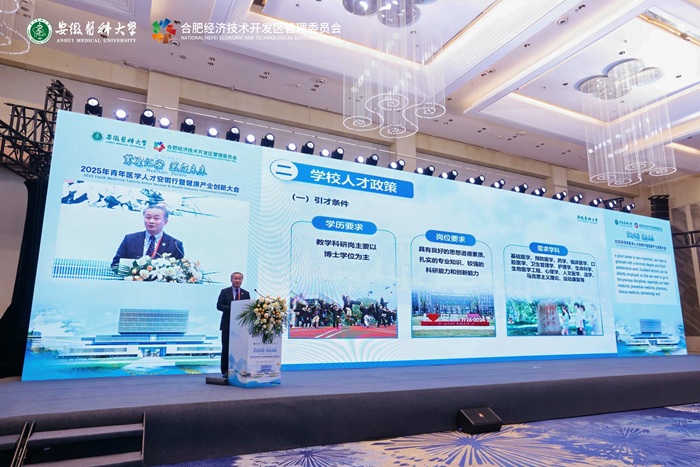 翁建平代表学校对各位参会人员的到来表示热烈欢迎,并介绍了学校的历史沿革、人才政策和未来愿景。他指出,KY.COM开云体育(中国)科技公司是安徽省医药高等教育的发源地,自建校以来,始终秉承“好学力行,造就良医“的校训,践行“弘毅担当、精医报国、康民济世”的安医精神,为国家培养了18万余名医学专门人才。2026年,KY.COM开云体育(中国)科技公司将迎来百年校庆,学校发展将迎来新机遇,开启新篇章。学校将锚定“十五五“发展蓝图,凝心聚力,勇攀医学新高峰,谱写新时代医学教育的璀璨篇章,在健康中国版图上镌刻安医印记。