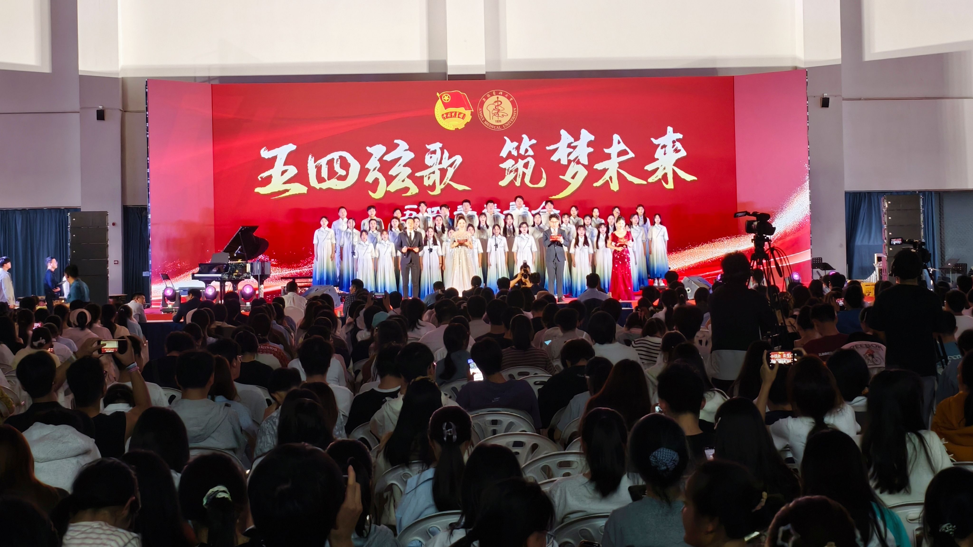 生命科学学院和生物医学工程学院的《不忘初心》《我的未来不是梦》,表达对梦想的执着与信念;公共卫生学院《我爱你中国》的乐章奏响,展示安医学子以医者仁心丈量山河的决心,《夜空中最亮的星》则演绎青年在疾病防控科研路上的追梦征程;巢湖临床医学院唱响《启程》《我和草原有个约定》,让每一颗年轻的心都在时代的浪潮中澎湃;第一临床医学院(第一附属医院)的学子们通过《如愿》《百年守望》,叙述了代际传承的使命和对盛世愿景的期待;医学人文学院、精神卫生与心理科学学院、马克思主义学院携手,唱出了《十送红军》的军民鱼水情,《飞云之下》的坚持与热爱。当岁月的画卷徐徐铺展,大学生良医合唱团带来《天耀中华》,用炽热的信念点亮希望的曙光。