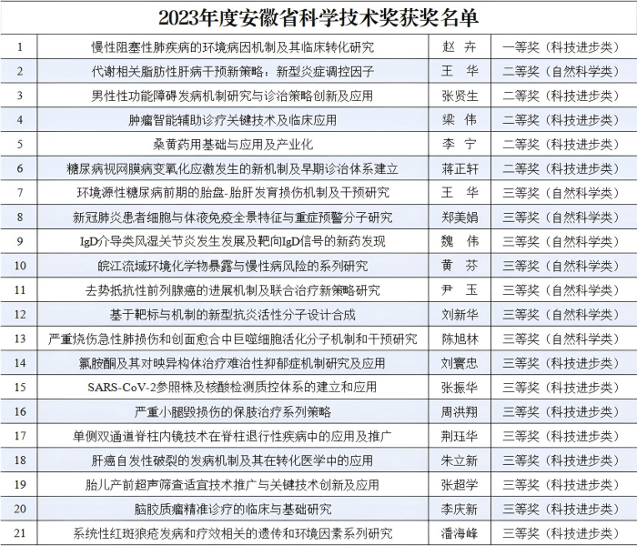 近年来,我校科技工作始终以习近平总书记关于科技创新的重要论述为指引,坚持教育优先发展、科技自立自强、人才引领驱动,持续深化科技创新体系建设,不断提升科技创新能力和水平。未来,我校将继续锚定医学领域前沿技术,集中优势资源开展攻关,力求在关键核心技术上取得新突破,加快把科技创新势能转化为高质量发展新动能,为教育强国、健康中国和美好安徽建设贡献安医智慧和力量。(科技产业部)