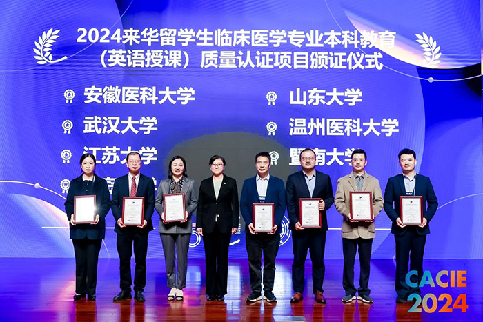学校注重培养来华留学授课师资队伍,建立全英文授课师资资格认定制度、国际学生教学督导员制度,开展十佳实习带教导师评选,举办校内来华医学本科教育青年教师英语授课大赛,选送教师多次获得全国大赛一等奖。注重来华留学课程建设,1门课程入选教育部来华留学英语授课品牌课程、1门课程入选安徽省来华留学英语授课品牌课程、3门课程入选中国教育国际交流协会精品在线课程立项。学校在中国文化传播黄大年式教学团队和省级留学生导学思政工作室平台基础上,依托省级重大教改项目,培养全英文标准化病人并应用于实践,提高来华留学生实践能力,相关教学成果获2024年安徽省教学成果一等奖。注重培养来华留学生创新创业思维,依托4个来华留学生创新创业基地、1个省级来华留学研究生联合培养基地、13个中国文化实践基地开展创新创业活动,获得“挑战杯”中国大学生创业计划竞赛国赛铜奖、“互联网+”大学生创新创业大赛省赛金奖等奖项。