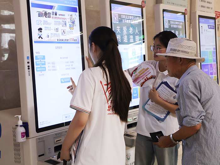 在广德市人民医院大厅,实践团成员积极为就诊群众提供导医导诊志愿服务工作,并重点面向老年人群体,深入科普了老年常见慢性病的预防、早期识别和自我管理等健康知识,为每一位患者提供细致入微的关怀和帮助。