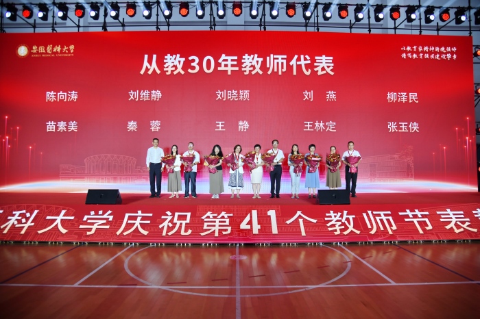 校党委书记王琦为从教30年教师代表颁发纪念章和鲜花,致敬他们躬耕教坛、无私奉献的崇高精神。他为获得省级及以上表彰的先进集体和个人颁奖,感谢他们为学校教学和科研事业做出的贡献。