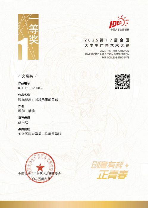 9月6日,2025年第十七届全国大学生广告艺术大赛全国总决赛获奖名单公布,我校顾翔、潘静两名同学以参赛作品《时光邮局:写给未来的自己》,获得全国一等奖,这是我校再次获得全国A类赛事最高奖项。
