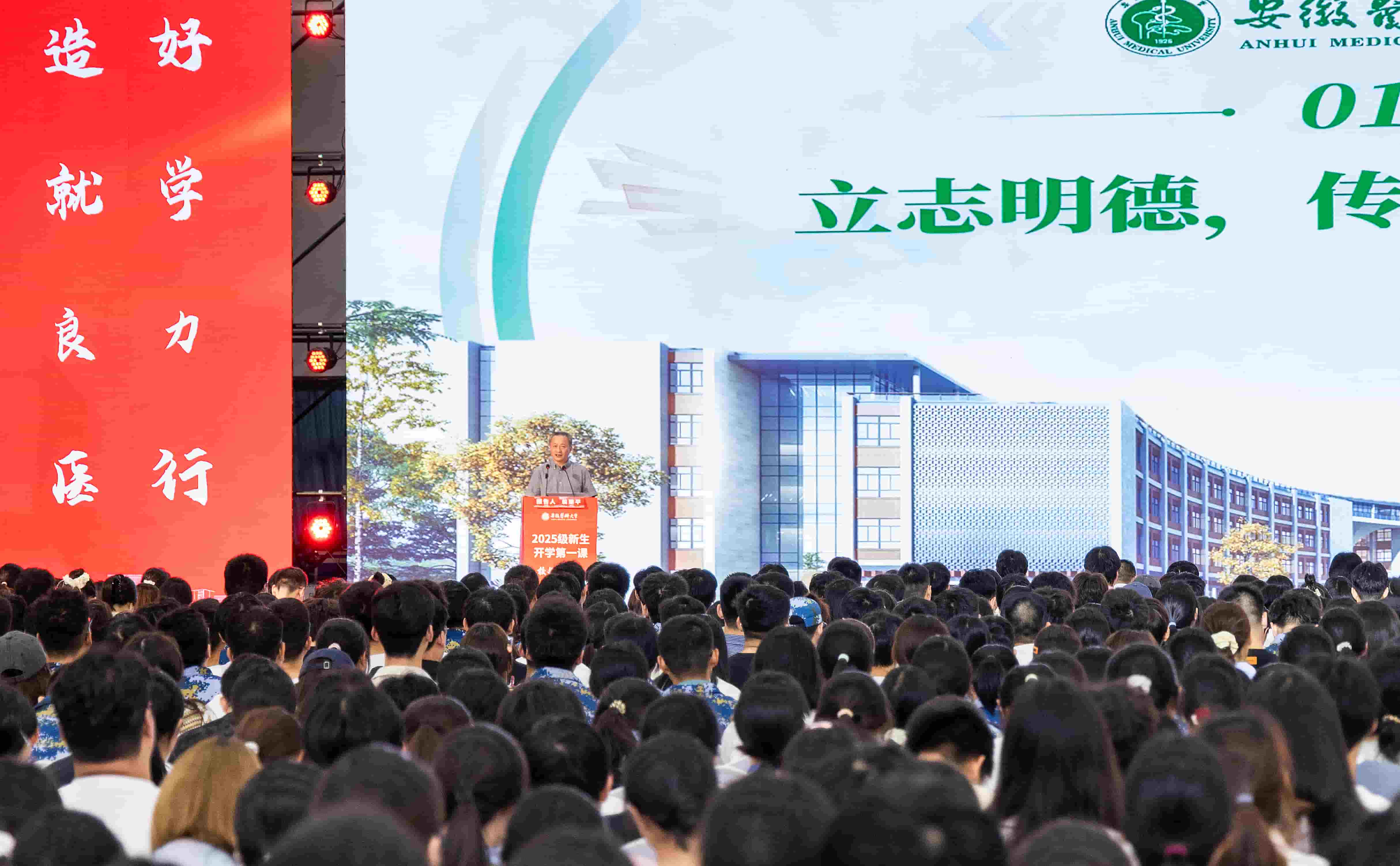 优美的校园环境、智慧化的教学设施、温馨明亮的宿舍、多元丰富的学生活动场所……谈到新校区新征程时,翁建平用一组实景图阐述了学校“以生为本”的培育理念。他表示,这里不仅是医学教育发展的重要承载地,更是安医学子实现梦想的广阔舞台。“围绕‘双一流’建设目标,安医大是冉冉升起的新星,更是你们梦想起航的地方,希望同学们能够把握机遇,与学校共同成长!”他鼓励同学们要以“人人都是建设者、人人都是维护者”的主人翁意识,积极参与新医科中心的建设和发展。