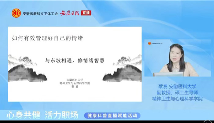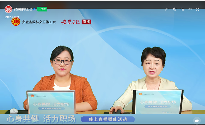 9月12日至19日,校工会受安徽省教科文卫体工会委托,承办省教科文卫体工会“心身共健 活力职场”线上直播活动2场,以切实守护职工身心健康,助力职工以更饱满的状态投入工作与生活。活动累计吸引全省教科文卫体系统职工超6万人次在线参与,为全省职工送上专业、实用的健康“大礼包”,收获广泛好评。