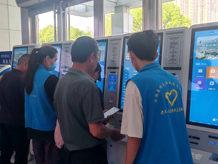 该院志愿者指导患者使用新自助挂号机。陈媛媛/摄