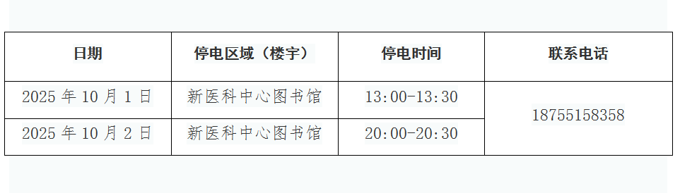 各部门、各单位:根据新医科中心(新校区)建设工作总体安排,计划于2025年10月1日(星期三)和2025年10月2日(星期四),对部分区域进行停电施工,停电安排详情见下表:请相关单位提前做好应对准备,给大家带来不便,敬请谅解!谢谢支持!后勤保障部2025年9月29日