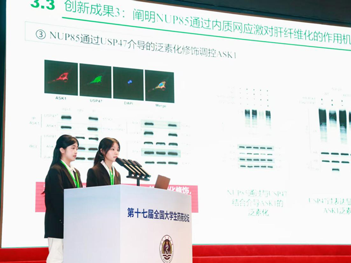 据了解,本届论坛共吸引来自北京大学、复旦大学、浙江大学、中国药科大学等126所高校的279项作品同台竞技,参赛规模与质量均创下历史新高。经过激烈角逐,由药学科学学院徐涛教授指导,该院2023级本科生占晔负责、华晗涵参与的《NUP85通过USP47/ASK1信号通路介导内质网应激调控肝纤维化进程》包揽本届赛事“创新成果一等奖”“优秀论文奖”和“优秀壁报奖”。