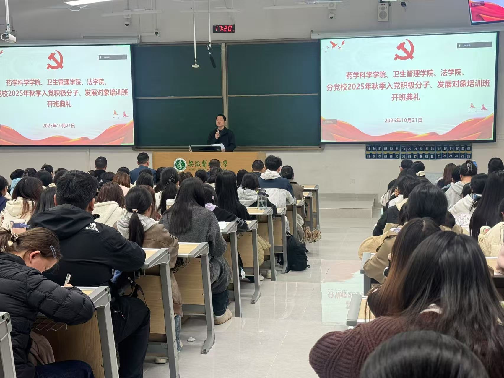 10月21日下午,药学科学学院、卫生管理学院、法学院、图书档案馆等四家单位,在新医科中心、梅山路校区线上线下同步举行2025年秋季入党积极分子、发展对象培训开班仪式。组织部副部长、党校常务副校长白亮亮出席开班式,并在开班式后为全体学员讲授党课《奋进新征程:中国式现代化的历史逻辑与青年担当》。