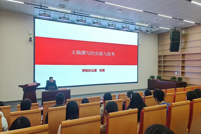 学校办公室副主任任嵩受邀,以《文稿撰写的实践与思考》为题作了专题报告。他结合自身工作经历,将文稿撰写能力的提升过程划分为“三个阶段”,系统分享了对文稿撰写的认知、感悟与经验。他表示,要通过“多学习、多涉猎、多调研、多搜集、多思考、多反思、多观察”来夯实基础,着重培养文字的思辨能力、说服能力与论述能力。要构建文稿的话语体系、知识体系和思想体系,不断拓宽写作视野,提升表达质感。任嵩还结合大量生动的工作实例,从敏锐度、对比度、逻辑度、跨越度、辨识度、饱和度六个维度,深入浅出地讲解了撰写高质量文稿的核心方法与技巧。