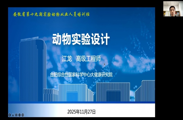 安徽省实验动物学会副理事长周宁、安徽农业大学教授谢忠稳以及合肥综合性国家科学中心大健康研究院实验动物平台主任江龙,分别作《安徽省实验动物行政许可管理》《实验动物模型及应用》《动物实验设计》的专题报告。