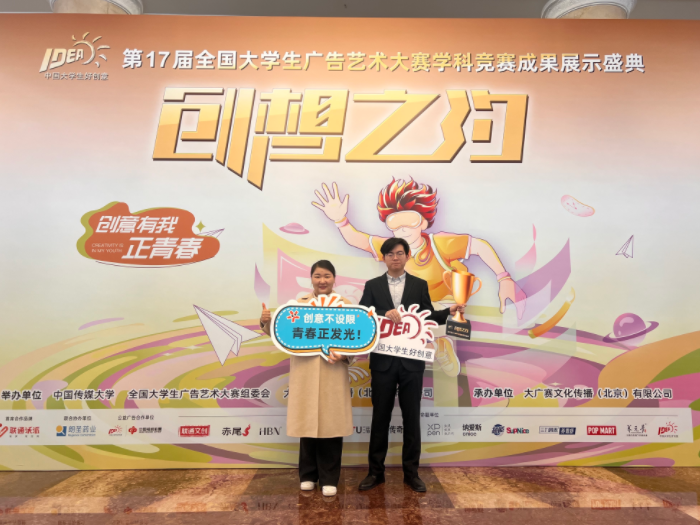 12月6日,第17届全国大学生广告艺术大赛学科竞赛成果展示盛典在北京举行,我校顾翔、潘静两位学子获文案类全国一等奖