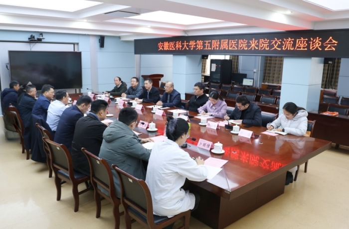 李阳新代表第一附属医院对第五附属医院一行的到来表示欢迎。他表示,在校党委的坚强领导下,两家医院密切协作,多年来第一附属医院参与、见证了第五附属医院的进步和发展。他表示,第五附属医院是一家有活力和朝气的年轻医院,也是学校“安医系”服务皖北的重要一环,希望两家医院继续深化合作、协同发展,不断打造安医品牌,共同为千万阜阳人的生命健康保驾护航。