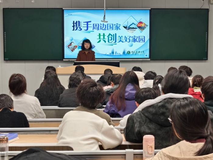 12月16日,副校长洪静芳以“携手周边国家,共创美好家园”为题,为2025级本科生讲授了一堂内涵丰富、思想深刻的形势与政策课。
