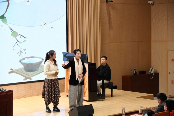 郑培钦结合自身丰富的表演经历,阐释民族歌剧的内涵和特点。她通过一帧帧角色海报、一个个角色故事,与师生共勉革命历史文化中的英雄事迹和爱国情怀。她与大家共同探讨了艺术与医学的共同本质“共情”,她指出“人文艺术,就是那剂增强抵抗力的良药”。