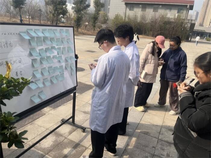 借阅书籍后,大家纷纷在便签上写下借阅理由并与自己约定好阅读时限。一张张便签贴满白板,承载着新生们对未来大学时光的美好憧憬与成长承诺。