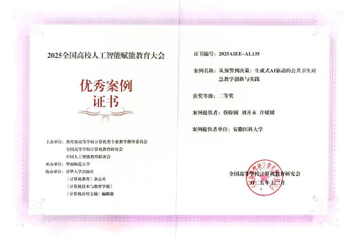 12月19日至21日,全国高校人工智能赋能教育大会在广州召开。我校公共卫生学院蔡盼圆、刘开永、许媛媛教师团队提交的教学案例《从预警到决策:生成式AI驱动的公共卫生应急教学创新与实践》荣获优秀案例二等奖。