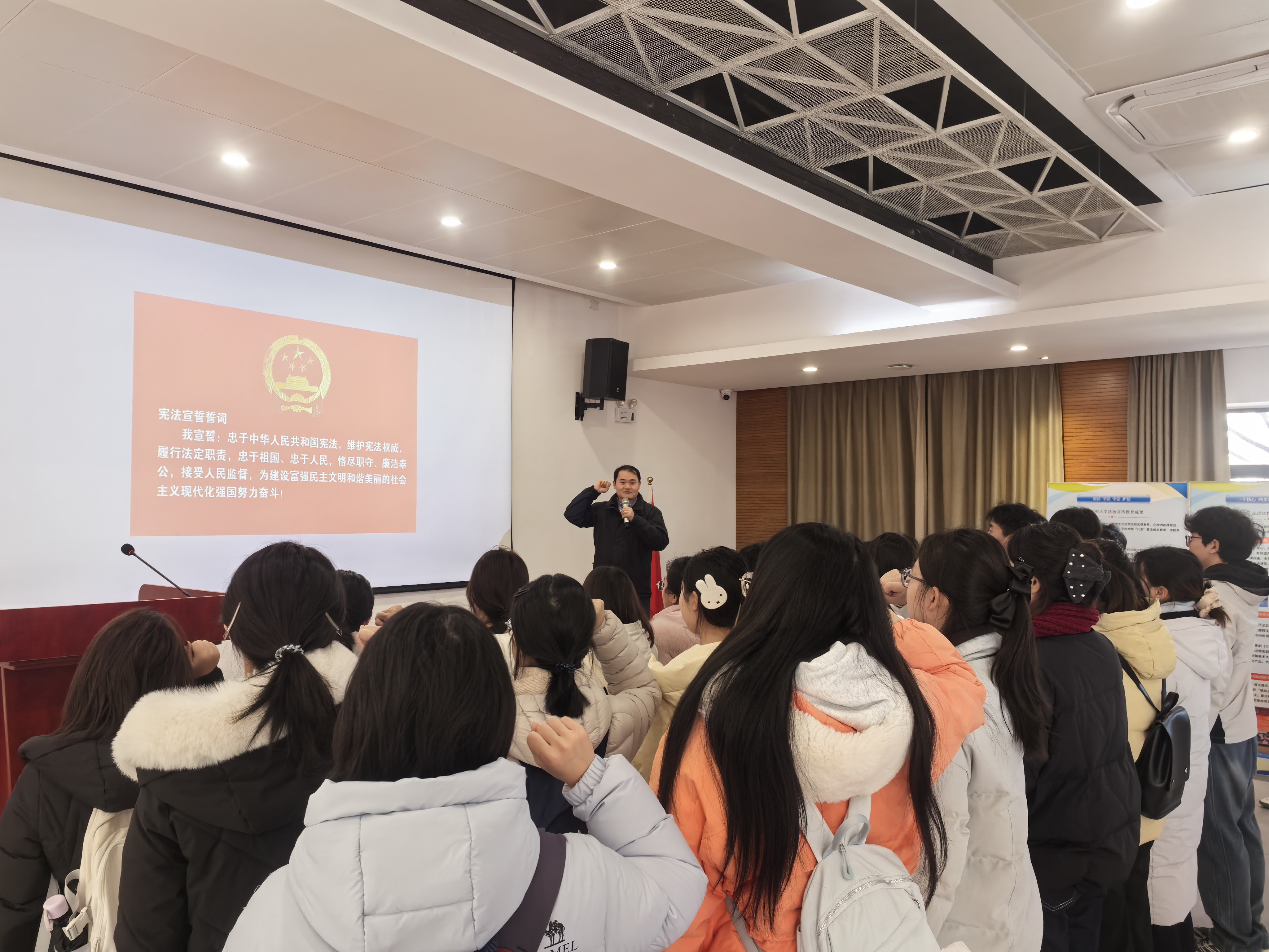 师生依次参观安徽监狱历史文化展廊、安徽省法治宣传教育长廊及2025年青少年法治教育主题展三大核心展区,师生们感受到法律的威严与历史的厚重,并围绕“权力与自由”和讲解员进行深度探讨。“我宣誓:忠于《中华人民共和国宪法》,维护宪法权威……”师生们在宣誓厅里庄严列队,铿锵有力的誓言回荡其间,将宪法精神内化于心、外化于行,完成了一次深刻的法治精神洗礼。随后,师生们走进由原合肥监狱禁闭室改造而成的包河区廉洁文化教育示范点,正面引领与反面警示交织呈现,为同学们带来震撼心灵的精神淬炼,实现了法治教育与廉洁教育的同频共振。