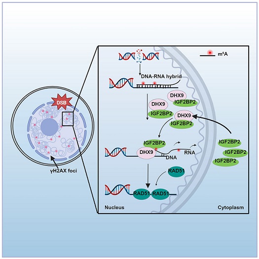 该研究首次阐明了 m6A-IGF2BP2-DHX9 轴在 DNA-RNA 杂合体清除及 HR 修复中的核心功能。这一发现不仅为理解基因组稳定性调控机制提供了新视角,也确立了IGF2BP2作为潜在癌症治疗靶点的转化研究价值,为开发基于DNA修复通路的新型抗癌策略提供了重要理论依据和实验基础。(生命科学学院)