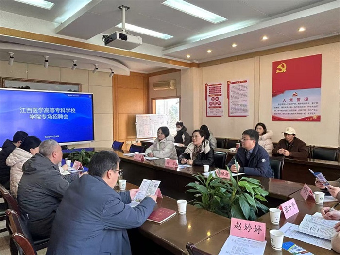 1月6日,江西医学高等专科学校党委委员、副校长杨华一行到基础医学院开展招聘交流。基础医学院党委书记储兵、院系领导班子和毕业班博士生参加交流会。
