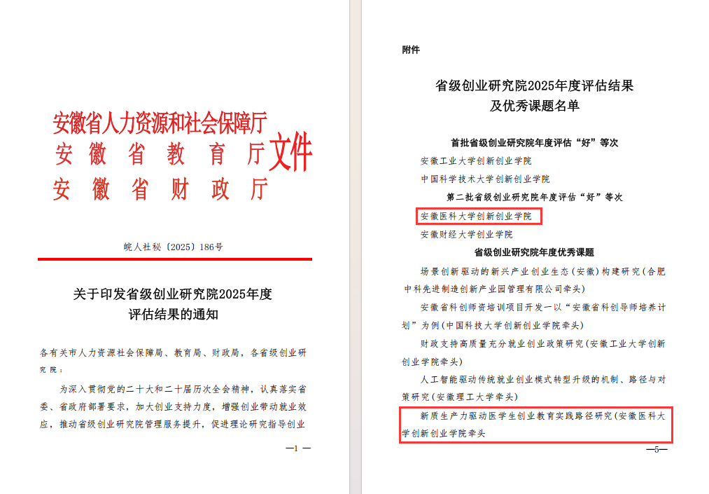 近日,省人力资源和社会保障厅、省教育厅与省财政厅联合公布2025年度省级创业研究院评估结果,我校创新创业学院荣获“第二批省级创业研究院年度评估‘好’等次”,牵头的重点课题《新质生产力驱动医学生创业教育实践路径研究》获评“省级创业研究院年度优秀课题”。