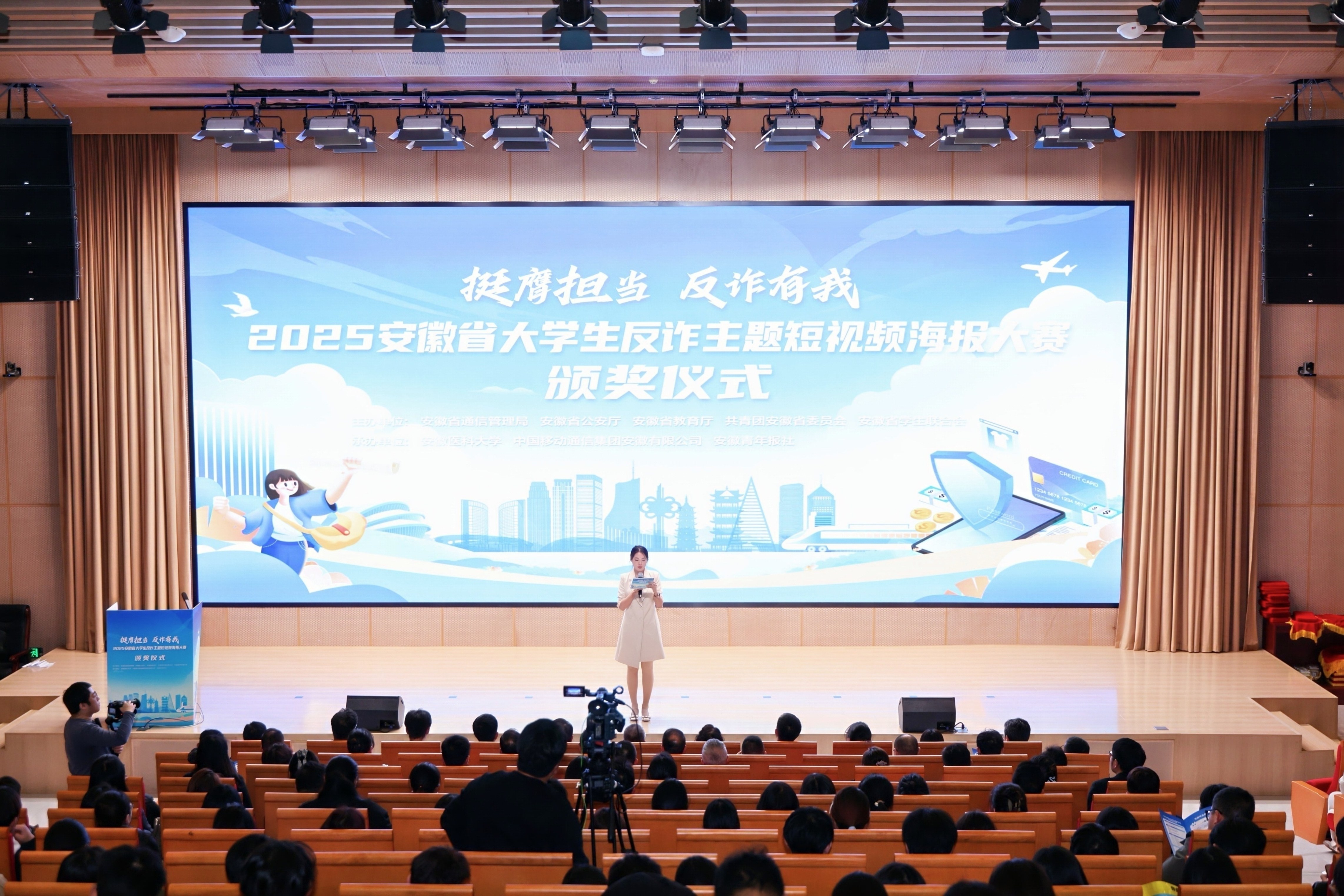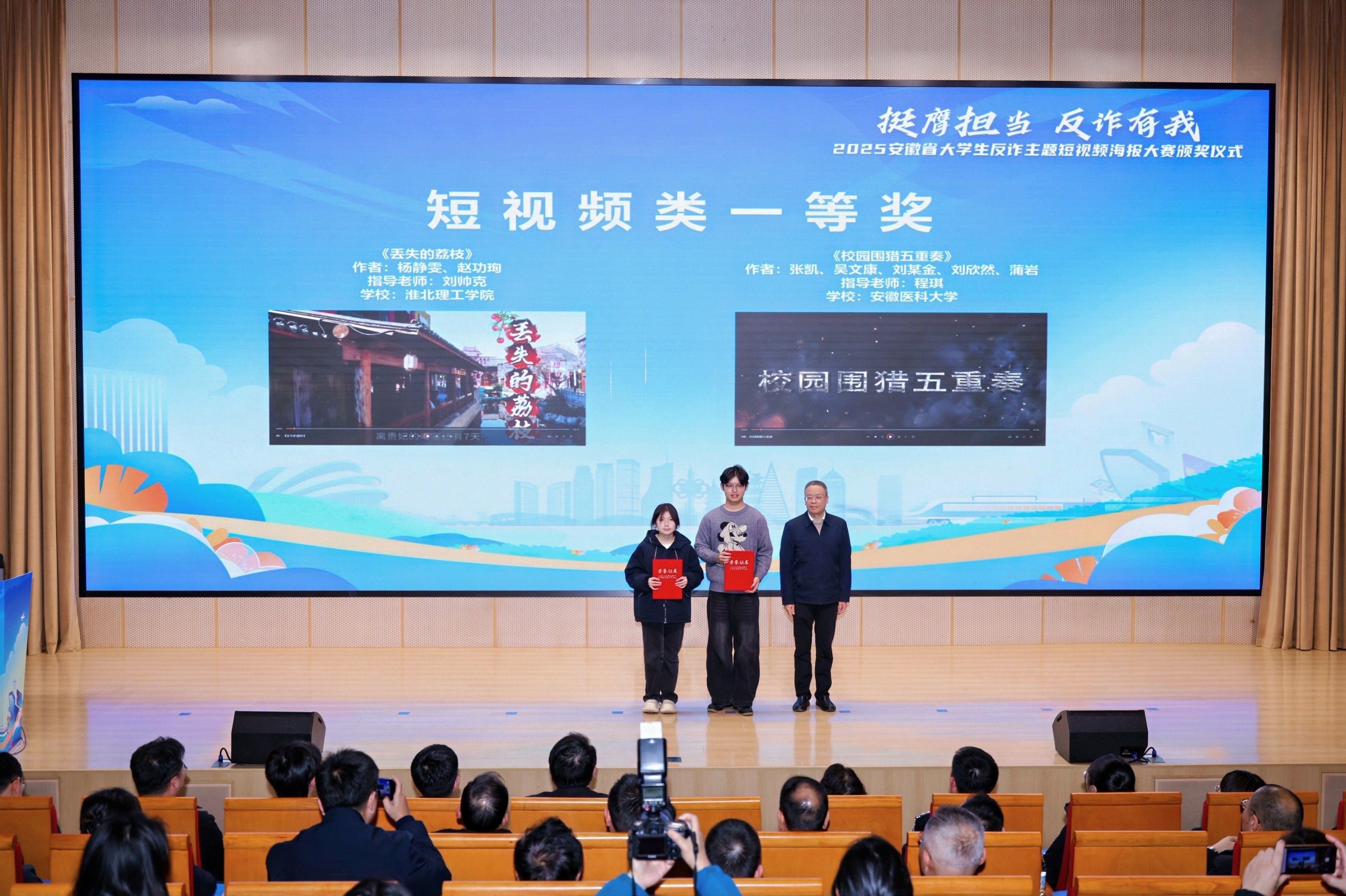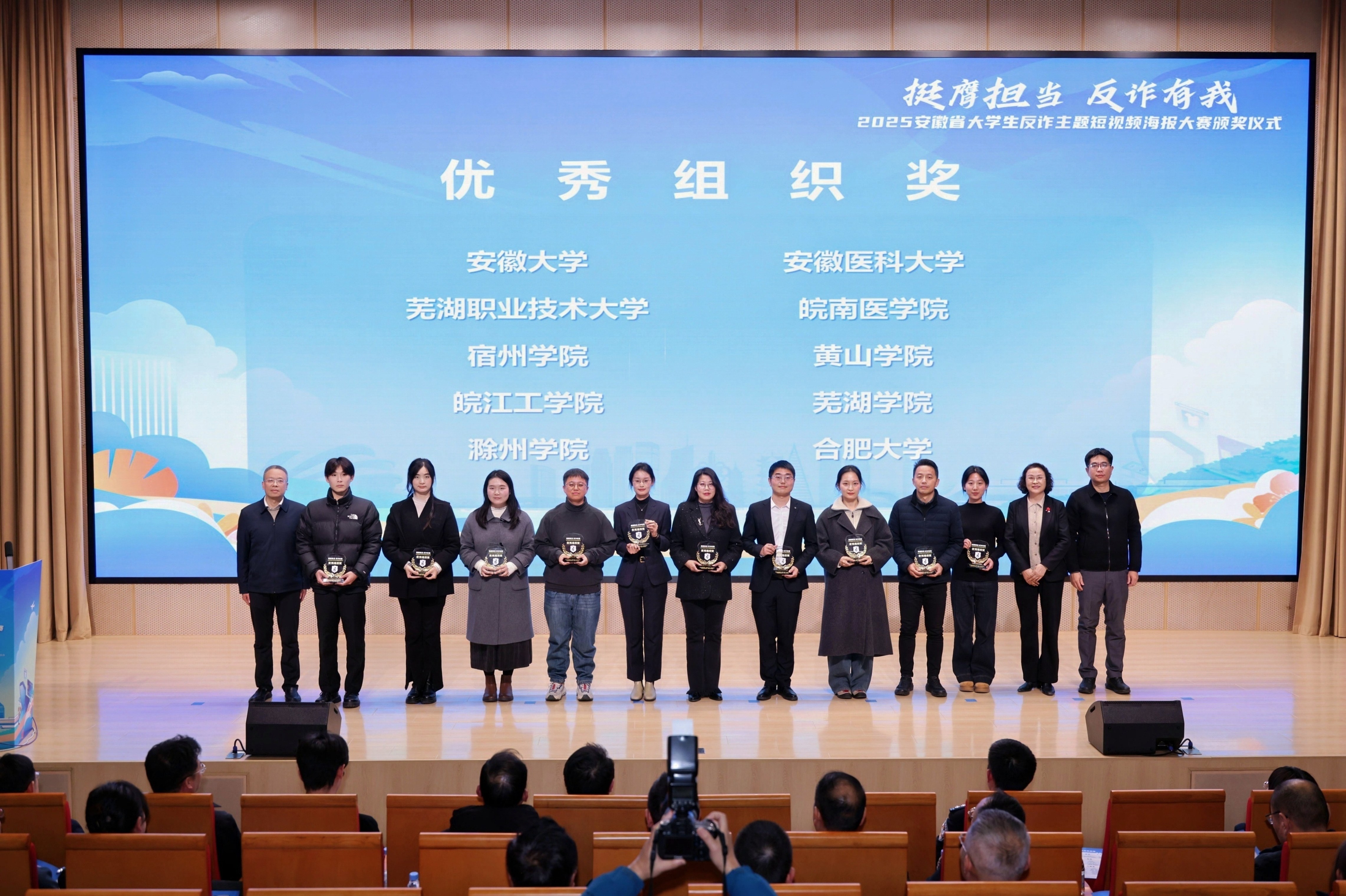 1月9日,2025年安徽省大学生反诈主题短视频海报大赛颁奖仪式在我校举办,我校报送的《校园围猎五重奏》获短视频类一等奖,学校获优秀组织奖。