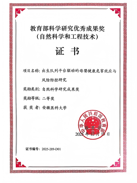 近日,教育部公布了2025年度科学研究优秀成果奖(自然科学和工程技术)授奖项目名单,我校获两项二等奖。其中,我校作为唯一完成单位,陶芳标教授作为第一完成人的《出生队列平台驱动的母婴健康危害效应与风险防控研究》项目获得二等奖,这是我校继2014年后,再次以第一完成单位获得该奖项。同时,由我校作为第二完成单位,张智教授作为第一完成人的《疼痛-情绪相互作用机制》也获得二等奖。
