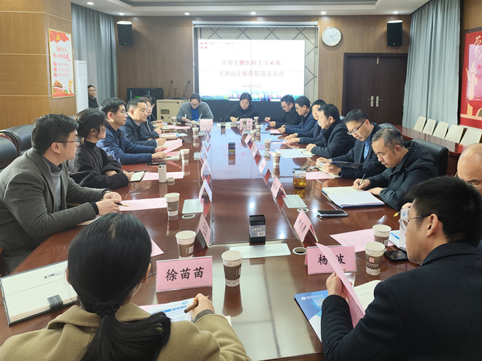 1月16日下午,校党委常委、副校长邱志海带队前往滁州市开展“访企拓岗促就业”专项活动,与当地多家医院和生物医药企业围绕人才招聘、实习实践基地建设、医教研协同发展等内容进行深入交流。滁州市卫健委党委委员、副主任汪洋参加调研活动。
