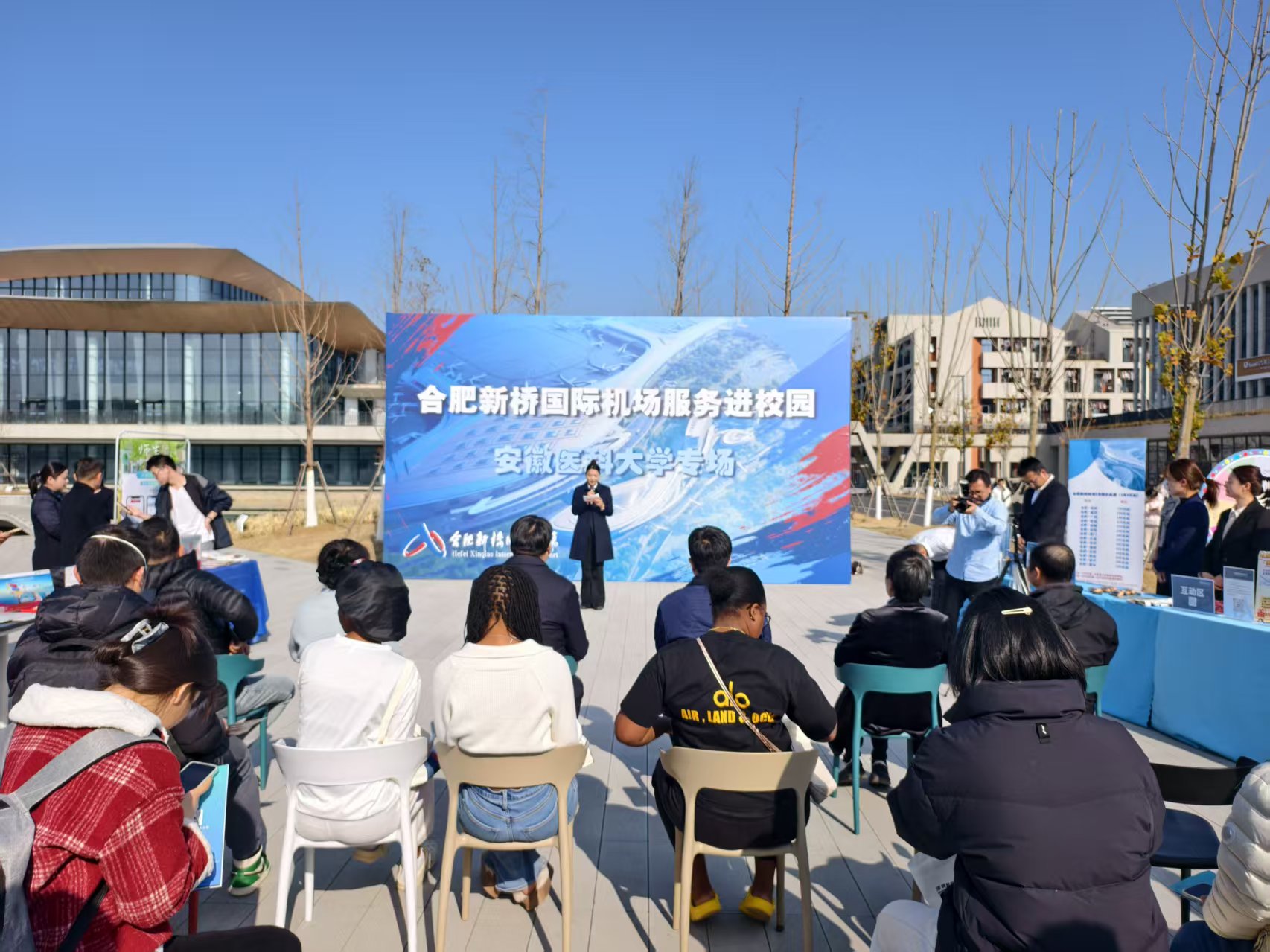 1月16日,合肥新桥国际机场来校举办服务进校园活动。校党委常委、副校长邱志海,合肥新桥国际机场有限公司党委副书记、总经理、董事万政云,党委委员、副总经理王丽霞参加活动。