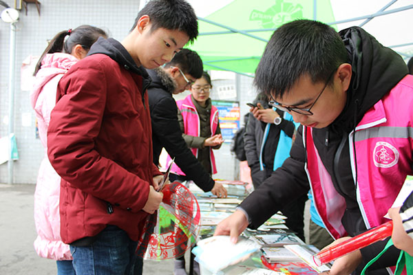 周四上午,在本部和南区校园里的食堂门前两队长队伍都为了领取安小毅系列明信片 12 张,以我校校园风光为主题明信片的 12 张,还有以 “健康中国” 为主题的春联和窗花。从 10 点半到 12 点半的两小时里,共计发出明信片近 2000 张,窗花近 300 对,春联 100 对。