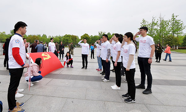在渡江战役纪念馆前,参加此次活动的 14 名师生党员以集体宣誓的方式,重温入党誓词。在鲜红的党旗下,全体党员举起右手、握紧拳头,庄严宣誓,重温入党誓词时的庄严承诺和坚定决心,在党旗下接受心灵的净化和洗礼,牢记共产党员的政治责任和历史使命,从而以更加饱满的热情投身学习和工作,切实发挥共产党员的先锋模范作用。