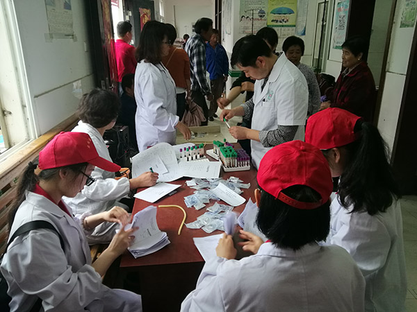 早上八点多,同学们冒着绵绵细雨,来到肥东县撮镇瑶岗社区卫生室开展义诊活动。一周前辅导员与社区医生约好这天给村民开展义务健康体检活动。数十名村民在瑶岗社区卫生室排队接受健康体检。同学们穿着白大褂,有序配合社区医生开展义诊。有的同学给村民抽血,有的同学给村民量血压,有的同学配合社区医生给村民做心电图、打印和分拣化验单,一丝不苟地完成医生分配的体检工作。在马克思诞辰 200 周年之际,同学们用无私奉献的精神、周到热情的服务来纪念马克思诞辰。