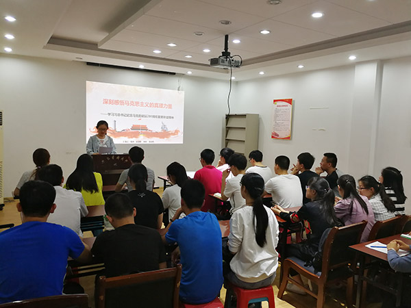 会上,老师和同学们一起学习了《习近平在纪念马克思诞辰 200 周年大会上的讲话》。随后,主讲同学带领大家一道重温了马克思伟大的一生、卓尔不凡的成就和马克思主义中国化的历程。三位在入党积极分子培训班中表现优秀的同学,分享了学习心得,发表了题为《学习马克思主义之吾辈青年在努力》的主题演讲。同学们结合党课的学习和自身理想,表达了新青年在新时代要高举马克思主义伟大旗帜,把握马克思熠熠生辉的精神实质,牢记实现中华民族伟大复兴的使命担当。最后,师生一起观看纪录片《不朽的马克思》。