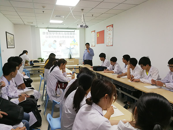 第二附属医院特邀台湾长庚大学物理治疗系谢宗勋教授为该院 2017 级康复治疗学同学开设讲座。讲座中,谢宗勋重点强调了物理治疗学过去和目前的定义,并介绍了台湾复健的发展现况,为同学们分析了国际一流康复的发展体系,拓宽了同学们的眼界。同时,谢宗勋明确了康复治疗专业学生未来的就业工作情况,进行了物理治疗人力预估,点明了社会对康复人才的需求量之大,极大激励了同学的学习激情,提升了专业自信。讲座的最后,谢宗勋热情地解答同学们的疑惑,并对康复学专业的学习方法进行指导,希望到场的同学们都能牢记使命,好学力行,成为一流康复人才。