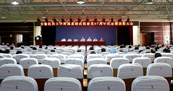 6 月 27 日下午,附属巢湖医院在综合服务楼学术报告厅召开建党 97 周年纪念暨表彰大会,院领导刘全礼、孙会芹、夏海龙、刘颀、葛丽丹、刘寰忠出席会议,院长主持表彰大会。