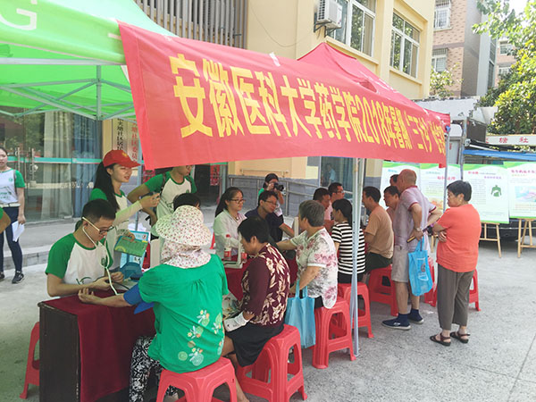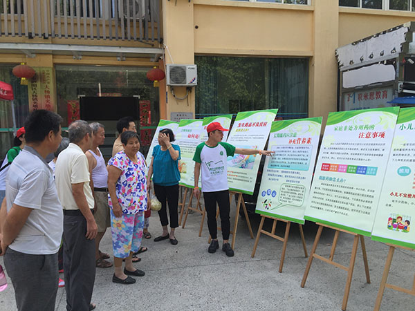 针对社区和村镇居民文化及认知程度的不同,团队还定制了不同的宣传材料和方法。在义诊现场,服务队精心设计了 “常见慢性病预防图片展”,“药品不良反应宣传”,“合理用药知识问卷调查”,“非处方用药注意事项” 与“孕妇小孩特殊群体服药安全须知”五个主题宣传材料,集中进行宣讲,将专业知识及日常生活的用药常识深入浅出地宣传,普及健康常识,提高居民对合理用药的科学认识。同时,队员们顶着酷暑炎热,组成 “卫星” 小分队深入居民家中、社区广场,通过发放宣传材料和药品展示及贴近生活的实例讲解,开展合理用药安全的问卷调研搜集第一手资料,积极推进健康中国建设。