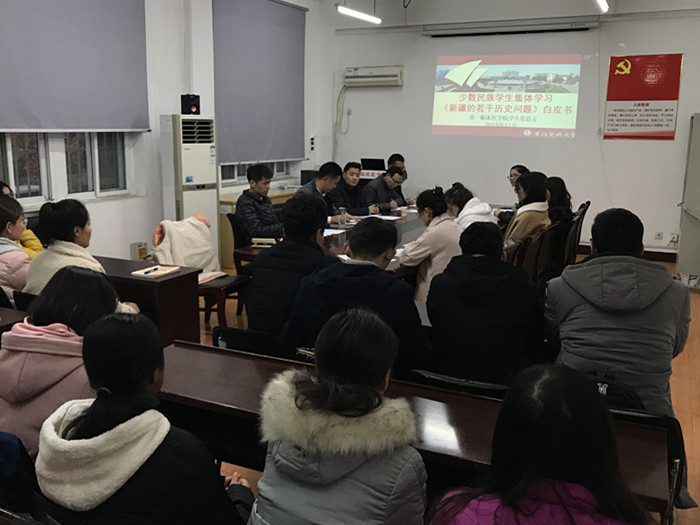 11月28日下午,在该院新疆少数民族学生集体学习交流会上,学生党总支副书记薛磊带领与会人员学习了《新疆的若干历史问题》白皮书,教育引导少数民族学生爱祖国、爱家乡,切实增强“五个认同”,自觉维护民族团结繁荣大好局面。他要求同学们深刻领会《白皮书》 的重大意义,深刻把握其精神实质和实践要求,坚定自觉地维护国家统一和民族团结。校学生处内派老师、该院少数民族专职辅导员及相关年级辅导员也在交流中对同学们提出了希望。各年级新疆少数民族学生则纷纷表示,作为青年大学生,要坚定共产主义远大理想和中国特色社会主义共同理想,坚决反对境内外敌对势力,为新疆的社会稳定和长治久安贡献青春力量。