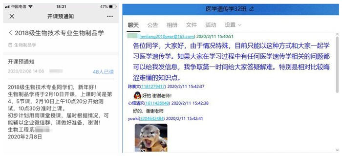 线上开网课,天涯共此时。线上教学的师生互动不如课堂教学直接。为了弥补这一缺憾,该院教师不约而同向学生们做出承诺:有问题请留言,无论身在何处,始终在线,随时答疑。同学们被授课老师们的敬业精神所感动,纷纷积极主动学习,学习气氛浓厚。