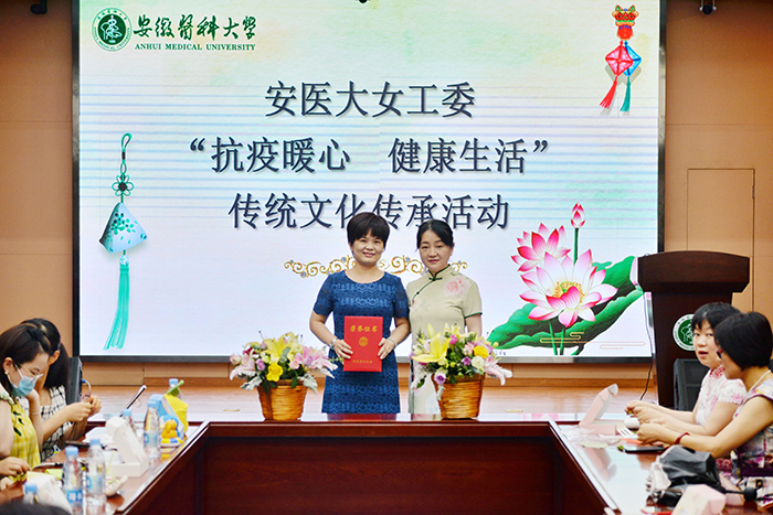 活动由香囊制作、抗疫防病知识讲座、形体仪态公益课及现场书画展示等四个部分组成。校工会副主席、女工委主任李群为全省“五一巾帼标兵”获得者、校医院防疫科主任贺晓琼颁发了证书。随后,贺晓琼为现场参与人员普及了疫情基本知识和防控手段、防控要点,就如何实施消毒、自我保护等进行了重点讲解,并建议大家减少去人群聚集的地方,保持良好的生活习惯。