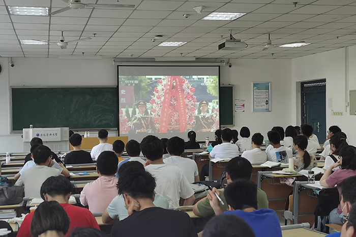 9月3日是中国人民抗日战争暨世界反法西斯战争胜利75周年纪念日。当天上午10时,习近平等党和国家领导人同首都各界代表一起,在中国人民抗日战争纪念馆向抗战烈士敬献花篮。在校校领导曹云霞、刘群英、余永强、肖圣龙、吕雄文、黄新美和全校师生代表150余人怀着崇敬的心情,共同在图书馆第一报告厅观看了向抗战烈士敬献花篮仪式的直播。